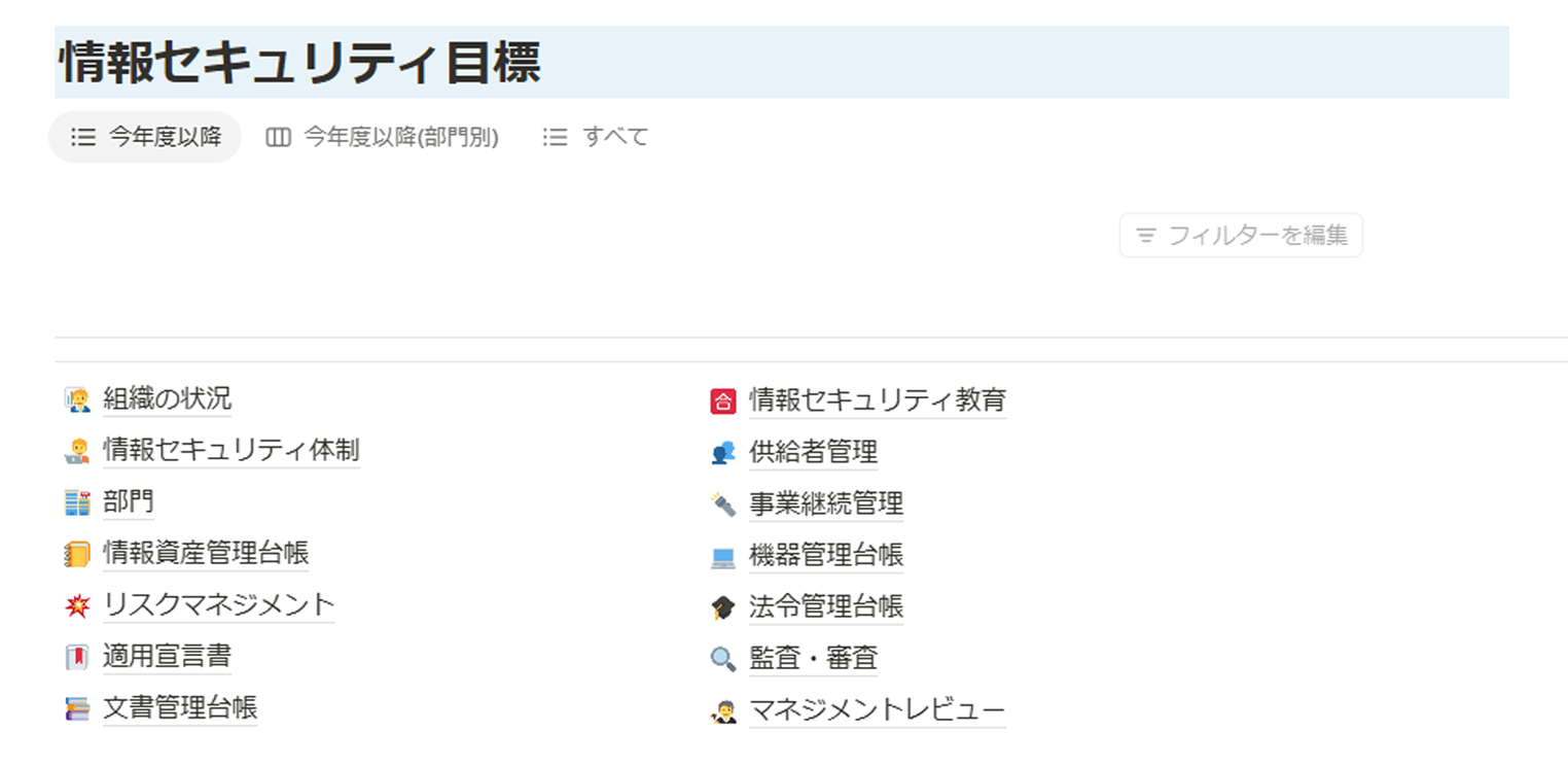 - Notion上にISMS利用マニュアルやセキュリティコンサルによる規格本文の解説をご用意しております。また、プランによりますが、進めるにあたって不明点等がある場合は、弊社専門コンサルタントがISMSやNotionの利用方法に関してもサポートさせていただきますので、ご安心ください。